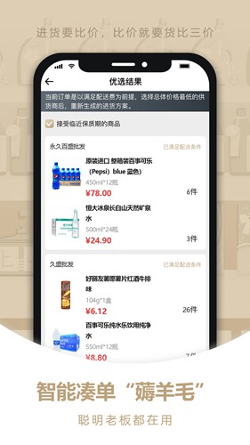 比价要进货,优惠更给力。渠道比价后可以直接提交订单啦,聪明老板聪明进货,货马上送到店喽!