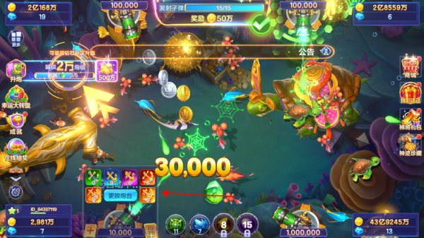 4、界面右侧还配备技能按钮,可释放冰冻、锁定等辅助技能,助力高效捕鱼。
