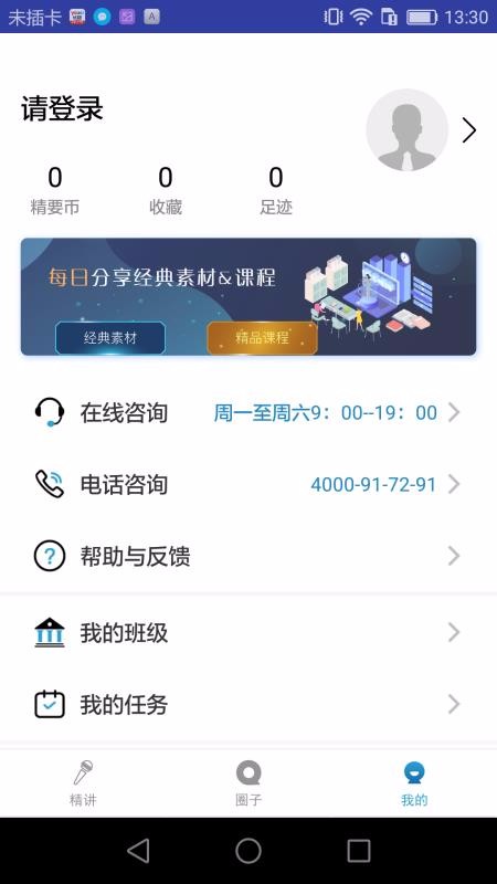6、点击 “我的” 进入个人中心,直接查看收藏内容、浏览足迹及精要币数量,还能查询班级详情。