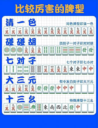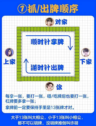 2、 基本流程:四人对局,掷骰定庄。洗牌后每人抓牌(庄家14张,闲家13张),庄家先出牌,之后轮流“摸一张、打一张”,目标是凑成合法牌型胡牌。