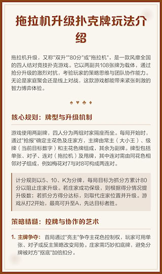 1、 基础规则:四人两队,使用两副共108张牌。庄家 vs 抓分方,目标是抢5、10、K分牌——抓分方得80分可阻止庄家升级,从打2一路升到A。