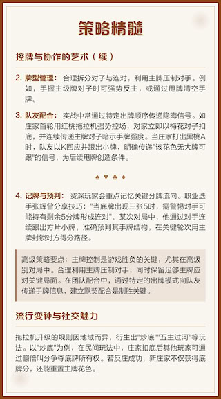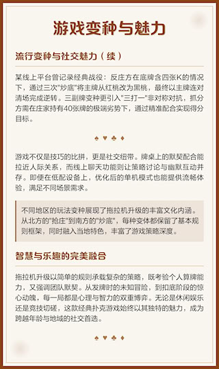 4、 进阶玩法:含“炒底”(叫分夺底牌重定主牌)、“五主过河”等地域变种;三副牌模式更考验极限配合。支持线上竞技与低配单机,社交与策略兼备。
