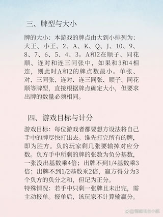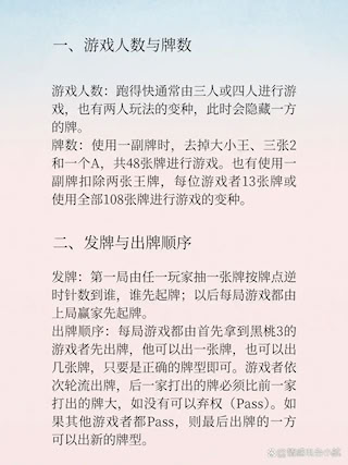 2、使用牌数:标准玩法采用一副去掉大小王、三张2和一张A的牌组,共计48张;部分地区则采用仅去掉两张王牌的52张牌,每人发13张,甚至还有使用完整108张牌(含多副)的变体规则。