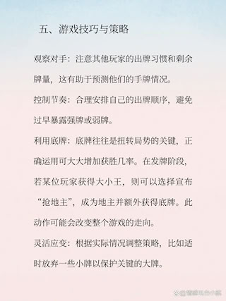 4、随机应变:根据牌局进展灵活调整战术,例如牺牲小牌保全核心大牌,以争取最终出完机会。