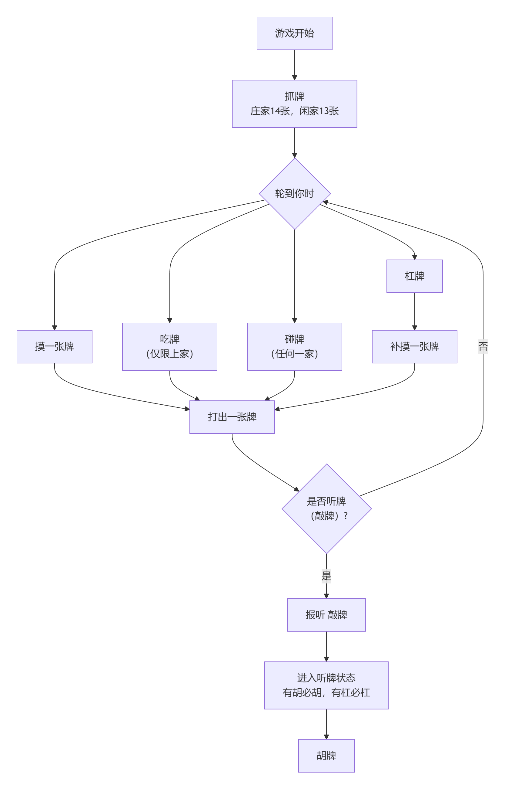 以下流程图为你概括了上海麻将一局游戏的核心流程,帮助你对整体玩法有个直观的认识。
