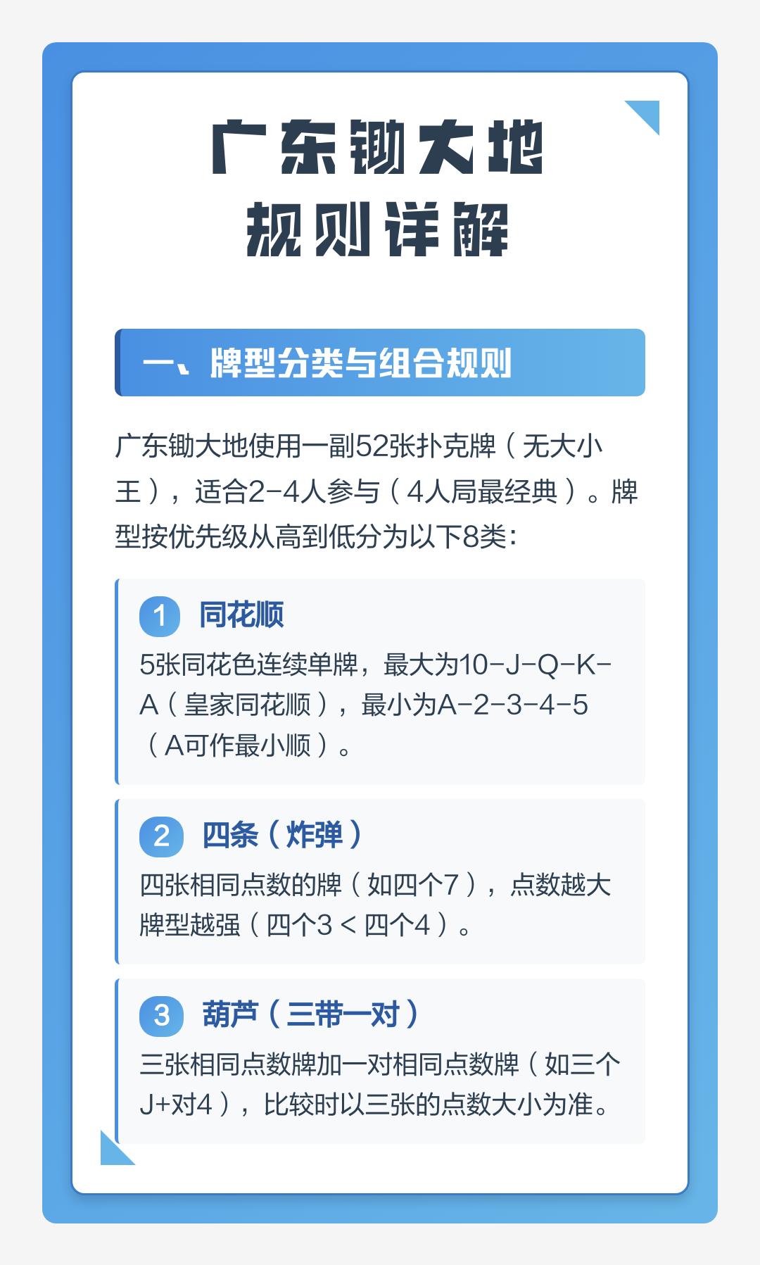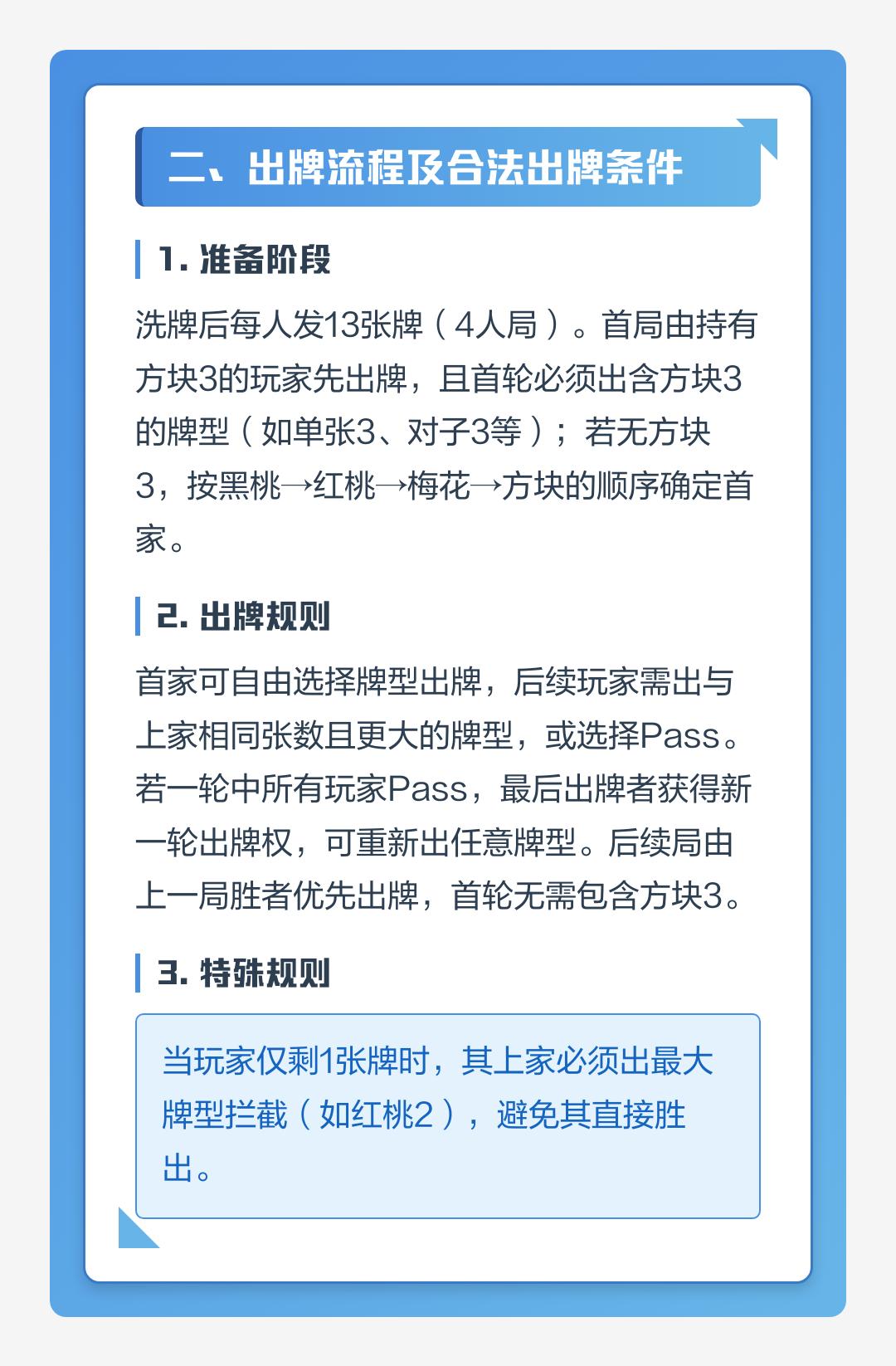 ② 轮流出牌:首家可自由出任意合法牌型;下家必须出相同张数且更大的同类型牌,或选择Pass。若一圈全Pass,最后出牌者获得新一轮出牌权。