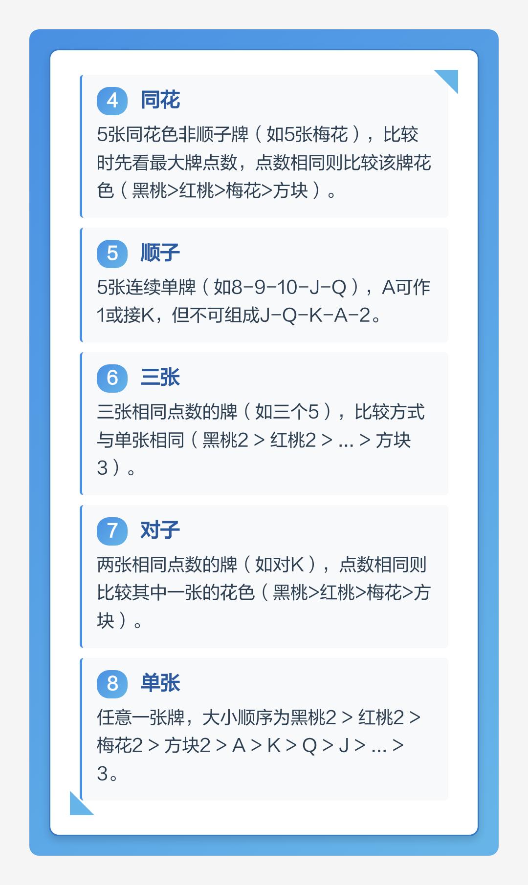 所有牌型比大小时,点数优先;点数相同时,按花色排序:黑桃 > 红桃 > 梅花 > 方块。