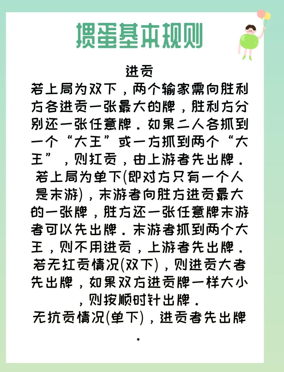 - 上一局“单末游”(只有一人最后出完):末游者将自己最大的一张牌进贡给头游者。