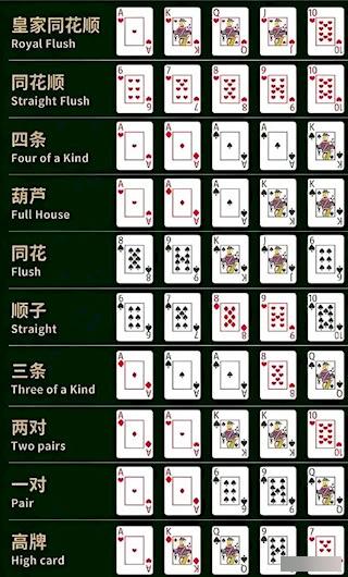 皇家同花顺 > 同花顺 > 四条 > 葫芦 > 同花 > 顺子 > 三条 > 两对 > 一对 > 高牌。胜负由玩家用2张底牌+5张公共牌组合出的最佳5张牌决定,牌型优先,点数决胜。