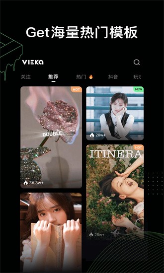 Vieka为您提供最流行的视频编辑模板。只需单击一下并上传您的照片/视频,就可以播放精彩的视频。