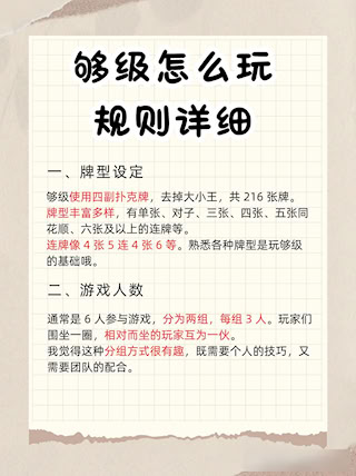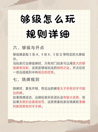 特定大牌组合称为够级牌,例如:5张A、4张K、3张Q、2张J等。打出后仅对门可应牌,形成核心对抗机制。