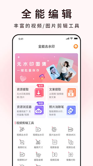 全能去水印APP里面关于水印的功能强大且全面,可以很好的满足用户关于水印功能的需求。同时,软件里面提供多样视频功能也非常的实用,为用户进行各种视频编辑提供了很多的便利,让用户可快速编辑各种视频,提高了视频编辑的效率。