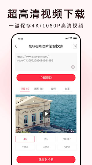 可以进行超高清视频下载,一键保存4K、1080高清视频,非常的方便。