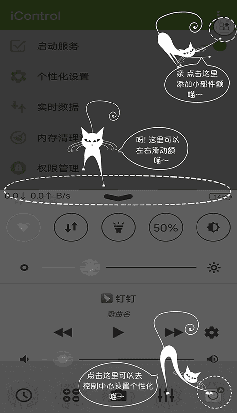 iControl控制中心是一个非常好用的仿IOS控制中心,软件本体的很小,不过可以为你带来很真实的模拟。让你的安卓手机可以调出和苹果手机一模一样的控制中心,在这里可以同样可以对手机的多方面进行控制,比如开启手电筒、调解屏幕亮度、开关WiFi、播放和暂停音乐等等,还可以在这里自己设置显示的快捷方式,将常用的app图标显示在这里就可以实现快速的跳转了,不需要再去找这个软件的图标启动。同时iControl还有高度的自定义设置功能,我们可以设置主题丰富,有白色风格、毛玻璃背景、流光溢彩灯光等等,还可以添加各式各样的小组件,让大家用起来更加的方便。采用了的是悬浮窗的模式,因此在初次使用的时候要给予悬浮窗和在其他应用上面的权限。