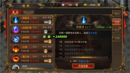 进入到角色的界面,玩家可以通过技能升级、转生等方式来提升战力