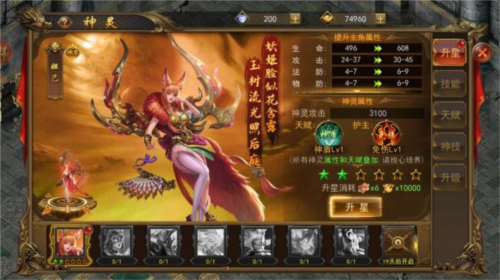 进入到神灵界面,通过升星、技能强化、天赋培养等方式来提升主角属性