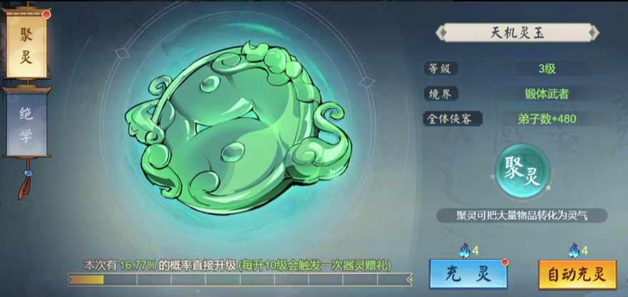 天机玉中隐藏了诸多失传已久的绝学武功,掌门可以通过聚令转化包裹中的装备,突破材料等物资,获得相应的灵气进行充灵。每一次进行充灵均有概率直接升级天机玉,当前充灵进度条拉满时则必然提升等级。天机玉每提升10级会触发一次器灵赠礼,打开器灵赠礼即可获得绝学碎片。