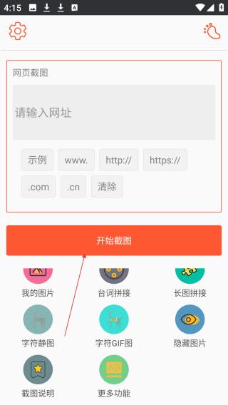 1、点击应用设有网址输入区与示例,点击开始截图可操作,还集成我的图片等多样功能。