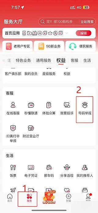 2、登录后进入应用主页,在底部或侧边导航栏中找到并点击【服务】选项,接着在服务页面中选择【客服】功能,再点击【号码举报】入口。