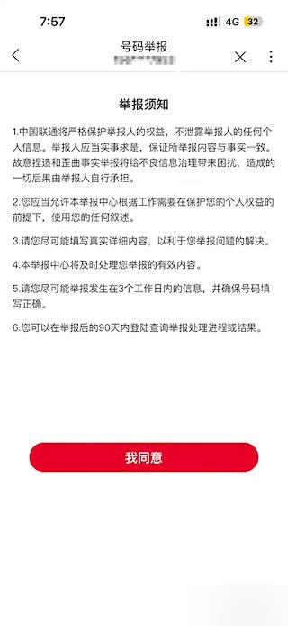 3、仔细阅读系统显示的《举报须知》全文,了解相关责任与规范,确认无误后点击页面下方的【我同意】按钮进行确认。