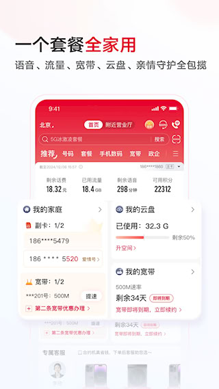 5、家庭套餐共享:支持语音、流量、宽带等多账户共享,搭配家庭云相册与亲情守护功能,实现一人付费、全家共用。