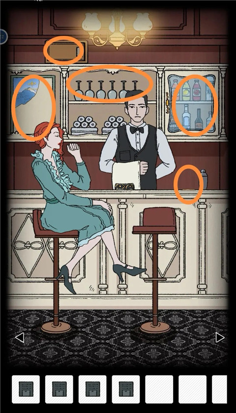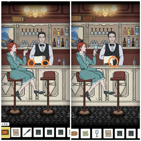 7、把鹅肝给服务生会给你一把钥匙A,用钥匙A打开锁上的酒柜,把空酒杯放在酒柜的下面,按照笔记残页配出爱尔兰马天尼(分别放入每份1次2次不同的比例,点击调酒杯出现的一个图标是开始摇,下面的是倒掉,如果配的酒不对或者之后还要酒,可以接着从柜子上拿空酒杯)