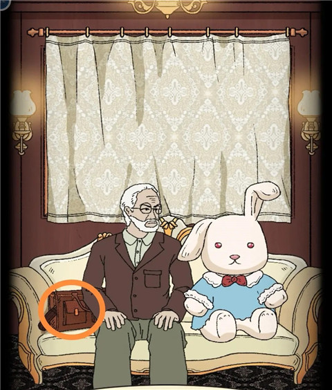 10、重新回到老先生这里,发现他会让你找兔子的眼睛,用木棒够沙发右侧地毯上的玩偶眼睛,交给老先生,把追踪器放在老先生身后的包里,并从他的手里得到营养剂给胖男人