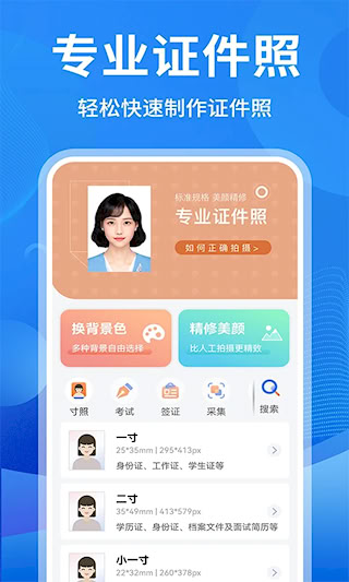 免费证件照制作是一款专注于解决日常证件照拍摄需求的实用型软件。提供覆盖身份证、护照、简历、考试报名等数十种标准规格的证件照模板,并具备智能抠图、自动排版等自动化处理能力,有效降低了自行制作标准证件照的技术门槛。使用者可通过手机相机拍摄或从相册选择一张正面半身照。系统会自动识别人像轮廓,实现精准抠图,并支持一键更换红、白、蓝等标准背景色。提供自然的美颜优化、服装替换等功能,在符合规范的前提下提升形象美感。