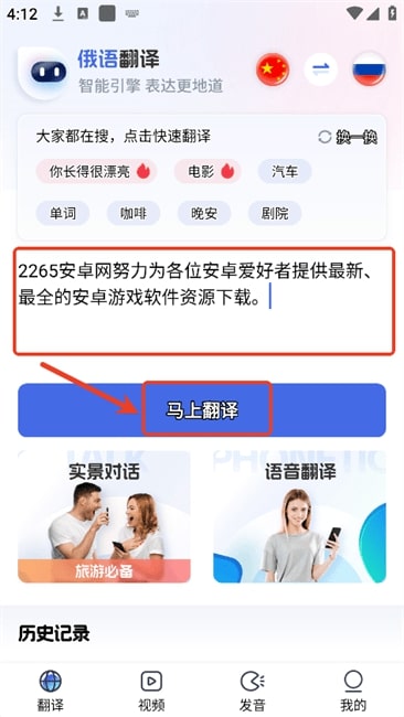 2、输入要转译的内容后,点击 “马上翻译” 按钮。