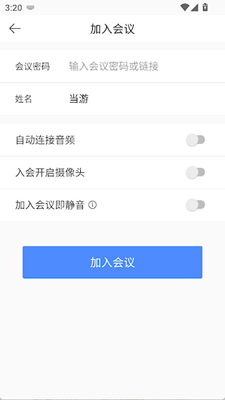 3、登录后点击【加入一场会议】,输入会议密码或链接、姓名,点击【加入会议】