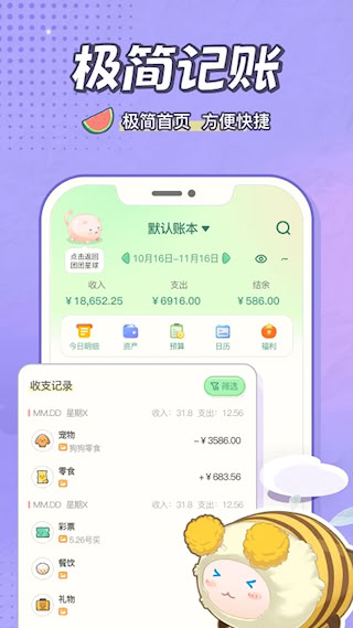 1、宠物养成记账系统,通过坚持记录收支获取虚拟食物喂养电子伙伴。萌宠会随互动频次展现不同成长状态,建立情感化记账激励闭环。