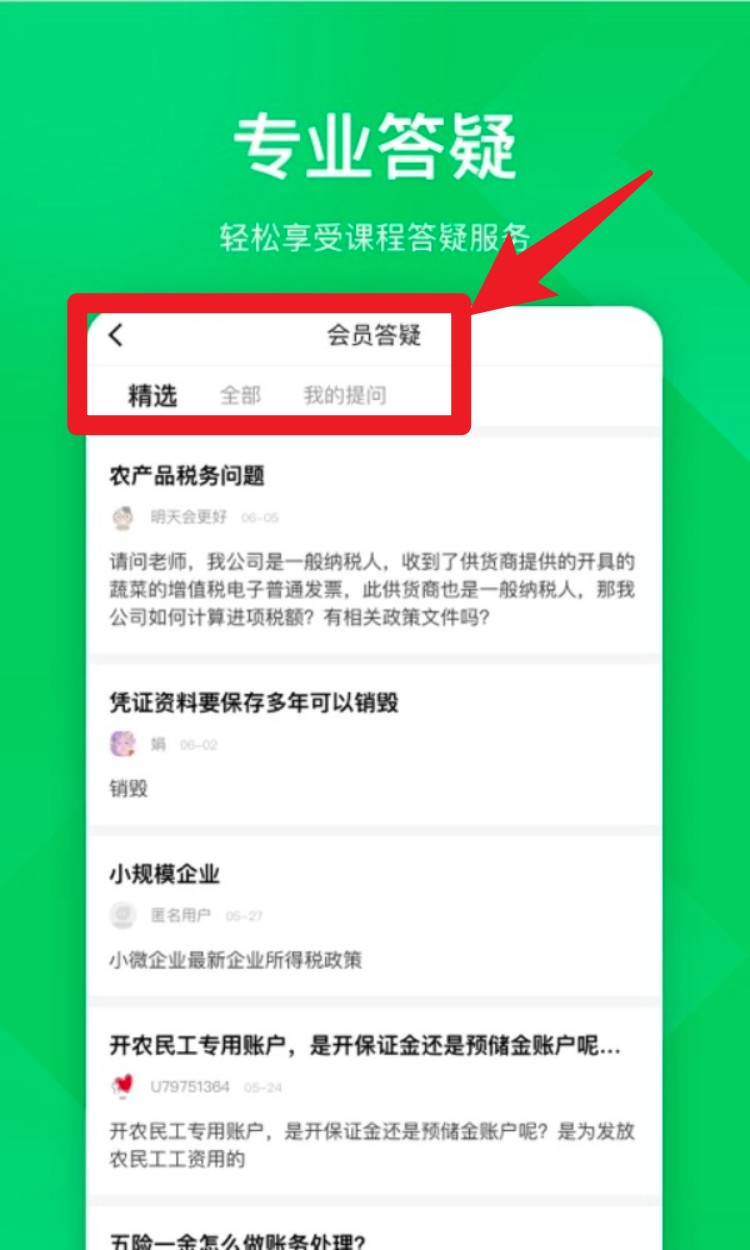 1. 进入会员答疑页面后,可浏览精选提问,或切换到我的提问查看个人提问记录。