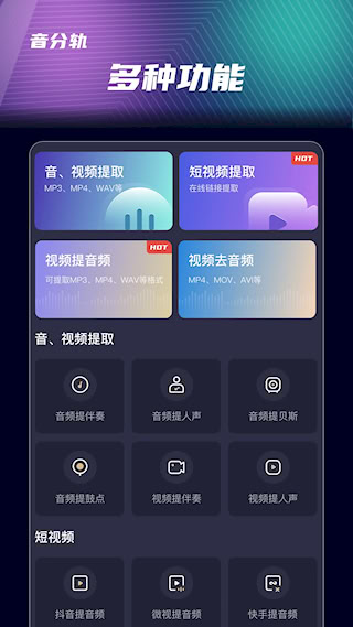 音分轨是一款基于先进人工智能技术的专业音视频处理工具。支持从混合音源中提取人声、伴奏及特定乐器声部,还能处理视频文件中的音频轨道。云端计算架构确保了处理速度与质量,使分离后的音频保持饱满、均衡的听感。有需要的小伙伴可以点击下载。
