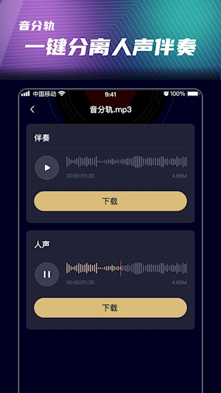 1、音分轨采用人工智能声源分离技术,能够从音乐文件中精准提取纯净的人声音轨。该技术可有效消除背景伴奏,保留清晰的人声部分,适用于歌曲翻唱或语音转录等场景。