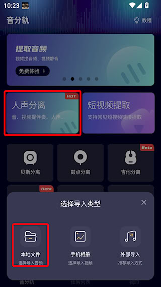 1、启动应用后选择人声分离功能,从本地存储空间导入需要处理的音频文件。