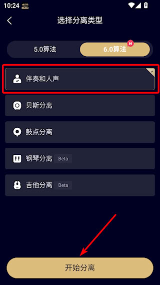 3、在分离模式中选择同时提取伴奏与人声的选项,启动处理进程。