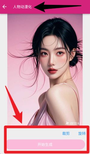 3、进入人物动漫化模块,上传人像照片后点击开始生成,系统会自动生成动漫风格的人像效果。