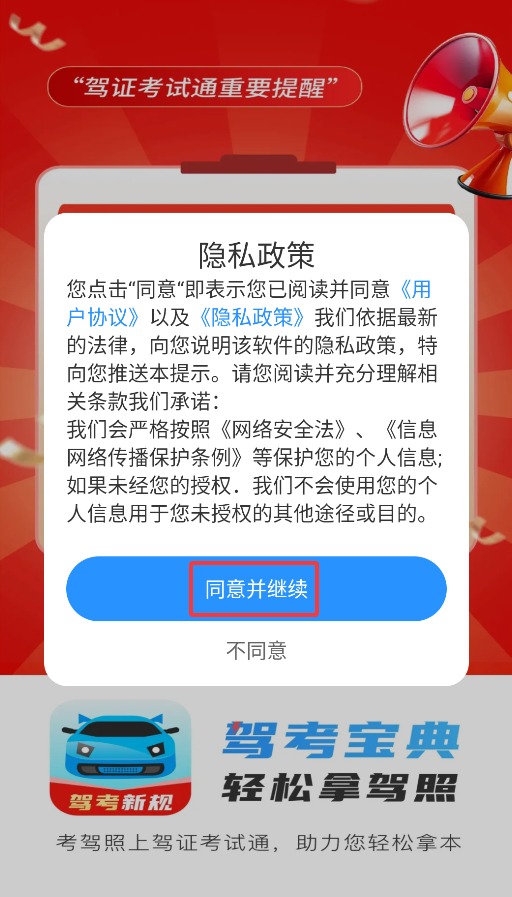 1、首次启动驾证宝典王app时需点击同意用户协议弹窗,方可进入主界面开始使用。