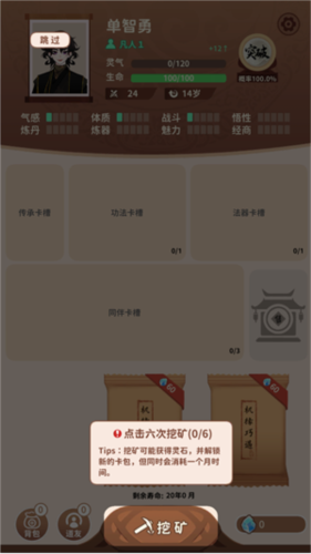 2、主要玩法就是点击下方的挖矿获得灵石,并用灵石购买卡包进行抽卡。需要注意的是无论是挖矿还是抽卡都需要消耗1个月的寿命,玩家的寿命将在下方进行显示。