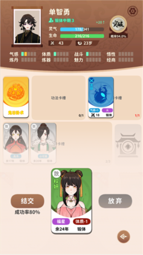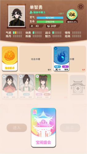 3、在抽卡的过程中,将有机会抽到角色卡、功法卡以及法器卡,每种卡都有装备上限,玩家可以自由挑选并装备。