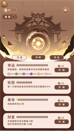 4、在玩家寿命耗尽后,本局游戏结束,可以选择再入轮回重新开局,而每一次游戏都将获得点数用来强化自己的天赋,或是解锁各种强大的传承。