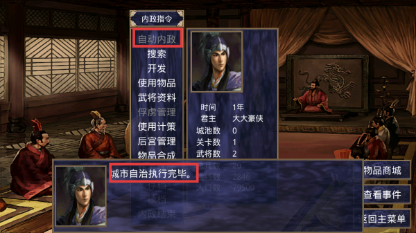 3、进入游戏后,点击【自动内政】功能按钮,系统将自动治理所拥有的城市。