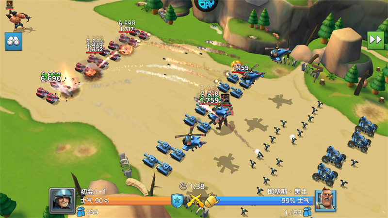 3、陆军、坦克、空军存在兵种相克关系,地形与天气还会影响战局走向。