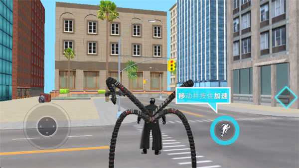 4、加载完成后进入操作界面,跟随新手指引;左下角为方向控制旋钮,右侧是技能按钮,按住指定按钮可实现 “跳跃” 动作。