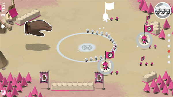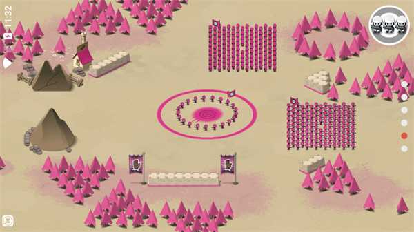 和许多其他同样是即时战略玩法的游戏一样,本作中也有需要占领的地方,我们可以称它为据点。据点是一个圆环样式的战略点,一般都会有其他颜色的士兵进行防守,而作为玩家来说,尽快消灭敌人并占领据点是首要任务。因为游戏特殊的颜色基调,使得玩家占领据点的行为就像是一种颜色扩散一样,可以在视觉上获得非常直观的成就感。