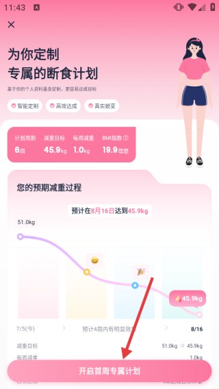 3、确认计划内容无误后,点击【开启首周专属计划】,即可启动属于自己的断食计划。