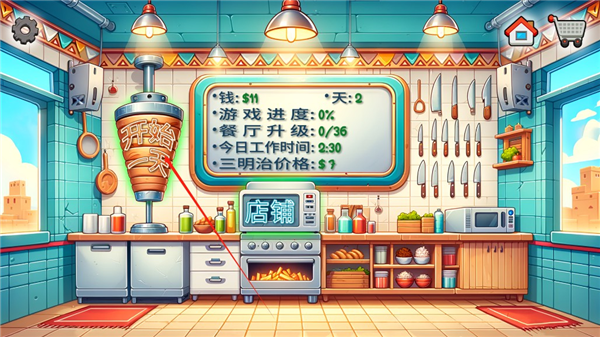 2、店铺装饰与升级 :自主设计店铺装饰(墙纸、桌椅等),凭收入升级设施提升服务效率。