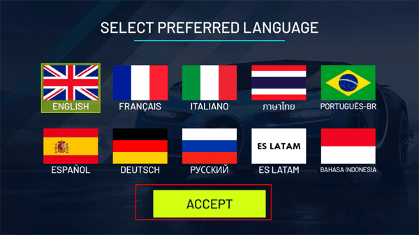 1、启动并进入游戏后,先选择熟悉的语言,选中目标语言后点击 “ACCEPT” 按钮确认设置。