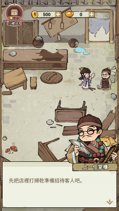 2、根据系统弹出的提示,完成客栈打扫任务,熟悉基础操作流程,为后续经营做准备。