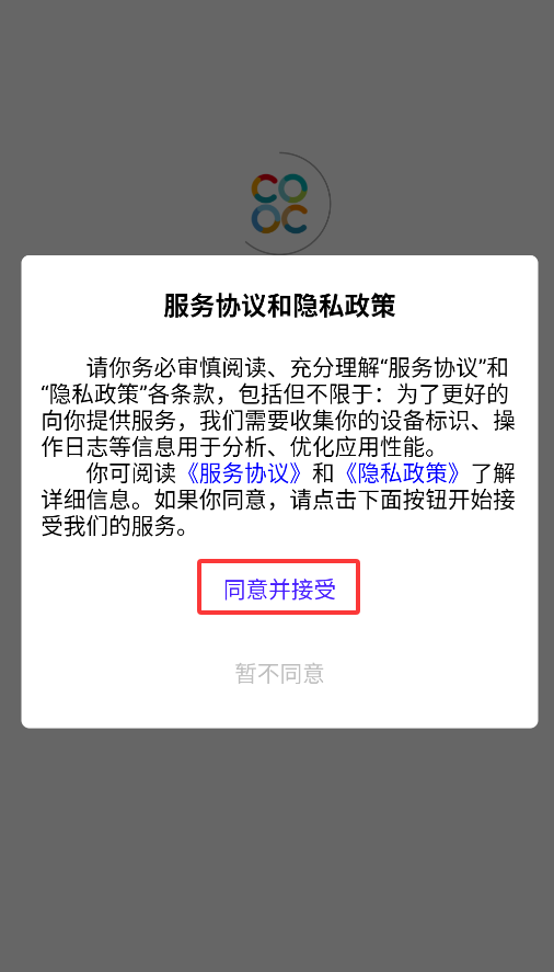 1、首次启动应用时,请点击弹窗中的同意选项,方可进入主界面开始使用。